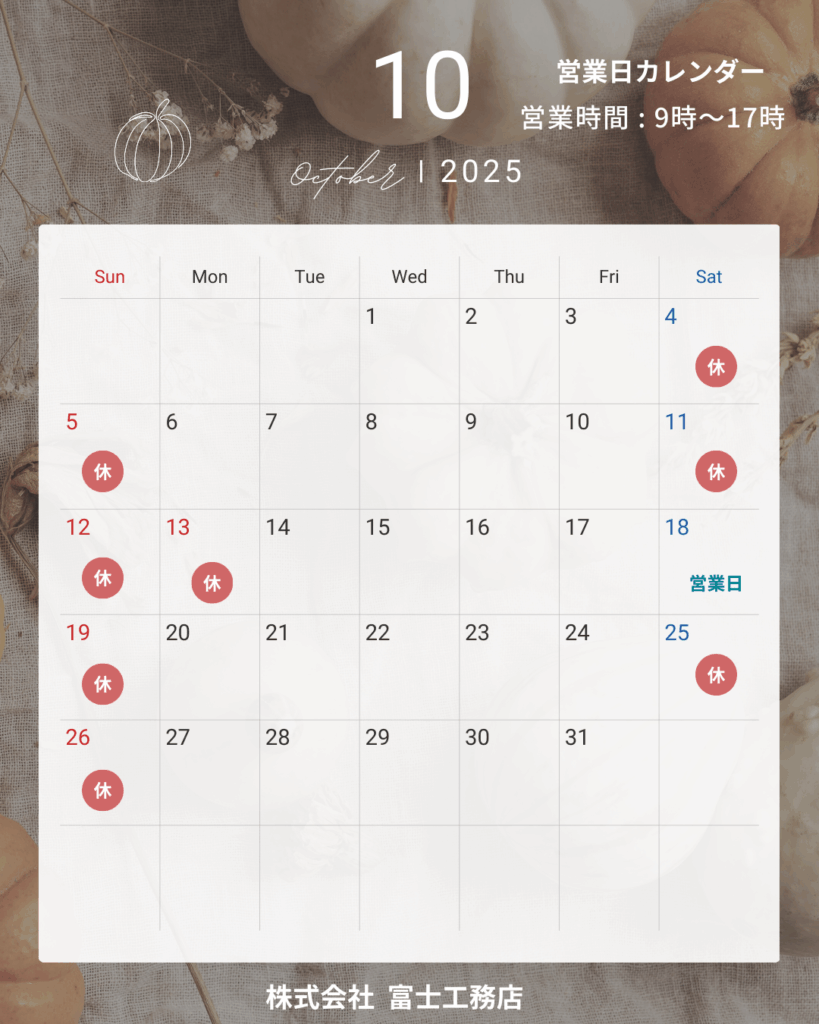 お知らせ NEWS トップページ お知らせ 10月営業日のお知らせ 2025.09.25 NEWS 10月営業日のお知らせ 平素は格別のお引立てを賜り、厚く御礼申し上げます。 弊社の10月の営業日をお知らせ致します。 下記のカレンダーをご確認下さいます様 お願い致します。 一覧に戻る 次へ