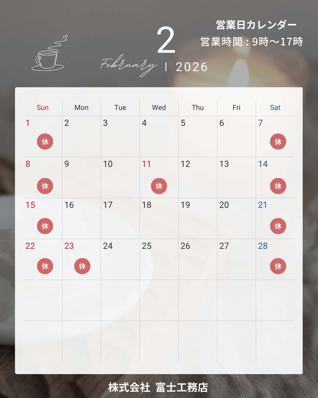 お知らせ NEWS トップページ お知らせ 2月営業日のお知らせ 2026.01.26 NEWS 2月営業日のお知らせ 平素は格別のお引立てを賜り、厚く御礼申し上げます。 弊社の2月の営業日をお知らせ致します。 下記のカレンダーをご確認下さいます様 お願い致します。 一覧に戻る 次へ